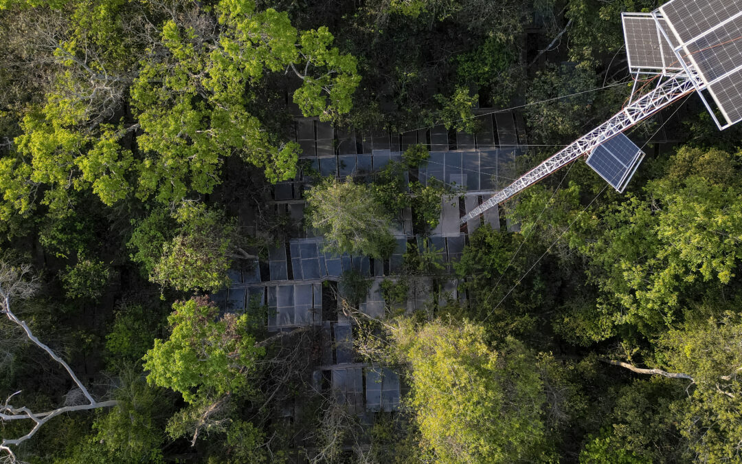 Sob o dossel da floresta amazônica brasileira, centenas de painéis de plástico transparente pairam entre os troncos das árvores para privar um hectare de terra de metade da água que normalmente recebe das chuvas.