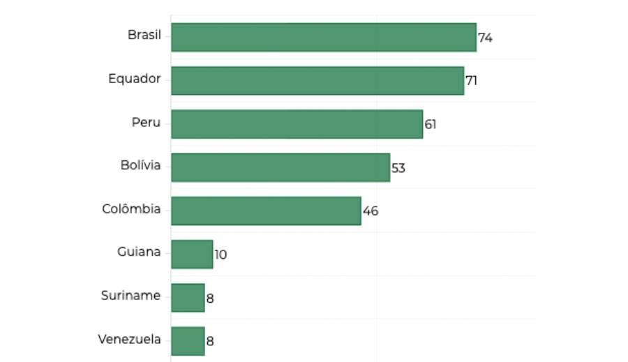 Confira a quantidade de blocos de exploração (incluindo os que estão em produção, em estudo ou em oferta) nos países da Pan-Amazônia: