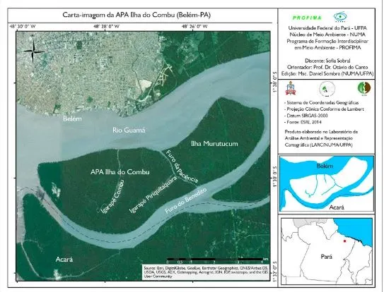 Carta-imagem das ilhas do Combu e do Murutucum (Belém, Pará). Mapa: Laboratório de Análise Ambiental e Representação Cartográfica (LARC), do Núcleo de Meio Ambiente (NUMA), da Universidade Federal do Pará (UFPA).