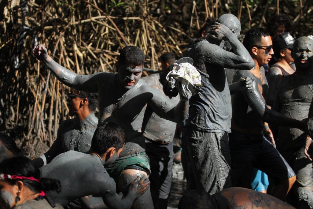 O cortejo de foliões fantasiados de lama do mangue sai tradicionalmente no domingo e na terça-feira de carnaval.